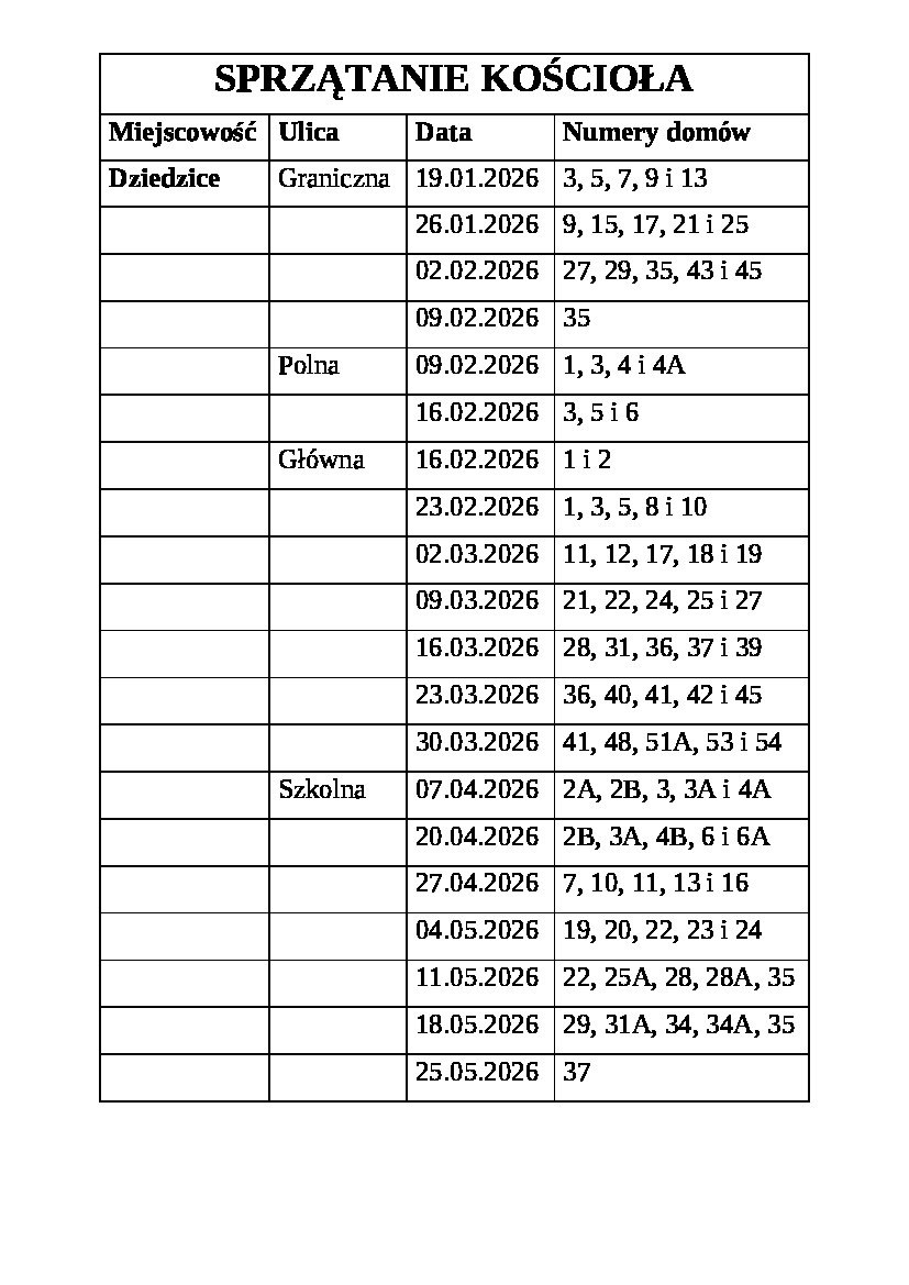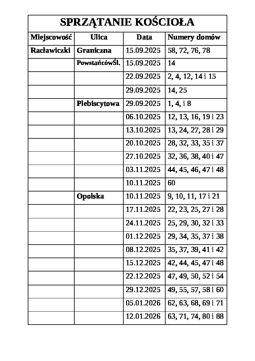 Harmonogram sprzątania kościoła