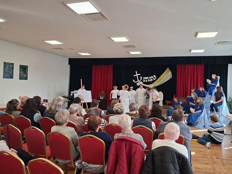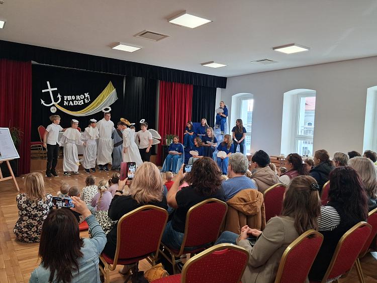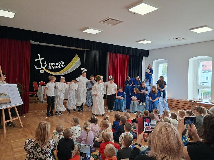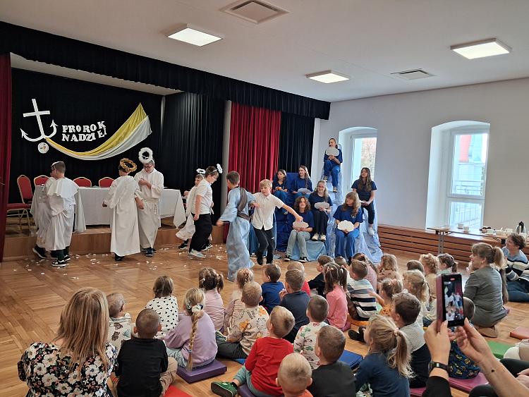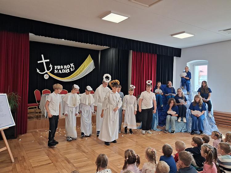 Uczniowie kl. VI przygotowaliu w tym roku z okazji Dnia Papieskiego spektakl pt. "Anioł Stróż Karola Wojtyły". W szkole ten dzień odbył się 16 pażdziernika, a w liturgiczne wspomnienie św. Jana Pawła II - 22 pażdziernika - jeszcze raz powtórzono spektakl - tym razem na sali Domu Kultury. Na to wydarznie zaproszono mieszkańców naszej parafii, którym wolontariusze z kl. VIII przygotowali również słodki poczęstunek.