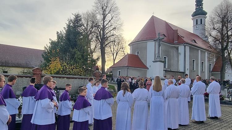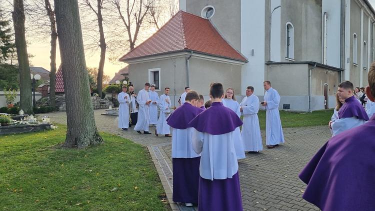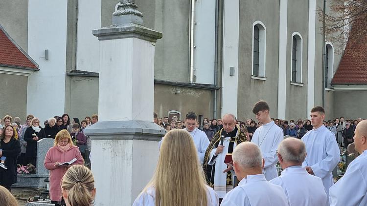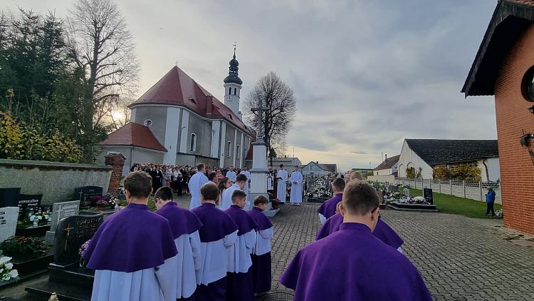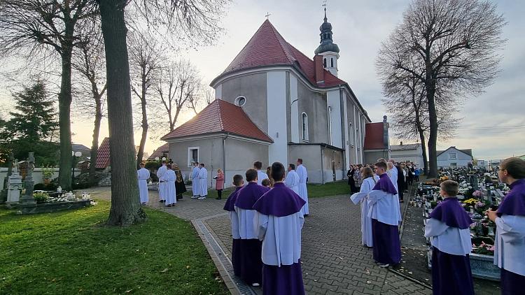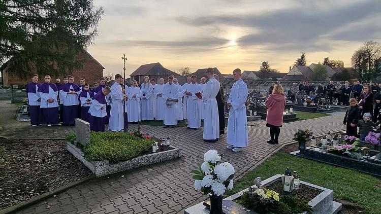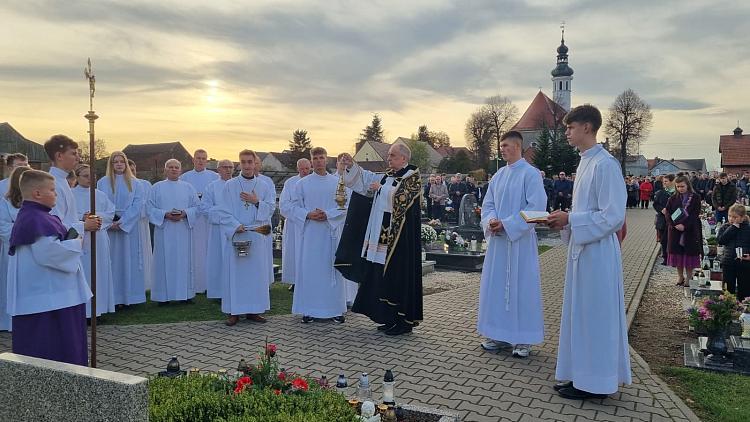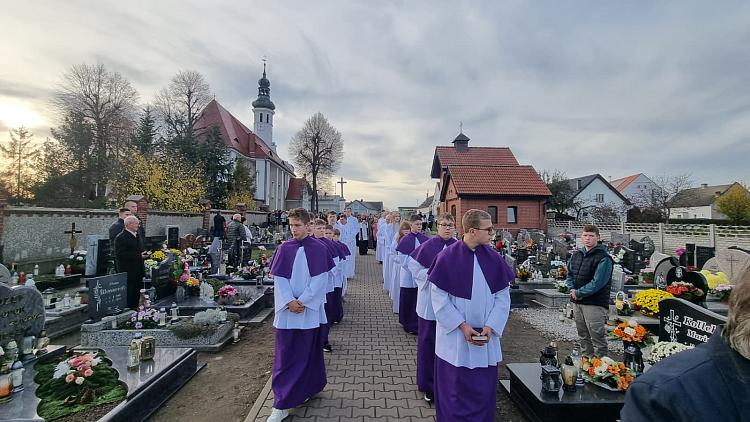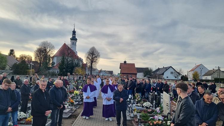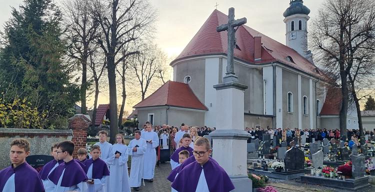 Tegoroczne popołudniowe nabożeństwo za zmarłych w Uroczystość Wszystkich Świętych zgromadziło bardzo wielu wiernych. Pierwsza część - nieszpory - odbyło się w kościele. Na koniec kazania Ks. Proboszcz odczytał tych zmarłych, którzy odeszli z naszej wspólnoty parafialnej w minionym roku. Następnie w modlitewnym skupieniu ruszyliśmy w procesji na cmentarz, gdzie przy poszczególnych stacjach powierzaliśmy Bogu naszych przodków. Przy pięknej pogodzie zakończyliśmy modlitwę na cmentarzu, a potem każdy w zadumie zatrzymywał się prz miejscach spoczynku swoich bliskich.