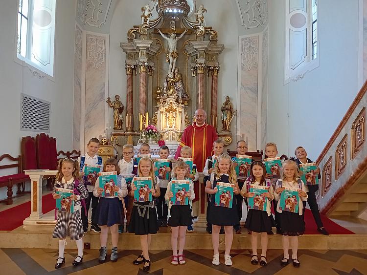 Po Mszy św. na rozpoczęcie nowego roku szkolnego Ks. Proboszcz poświęcił nowe tornistry i przybory szkolne naszym pierwszakom oraz wręczył im podręczniki do religii.