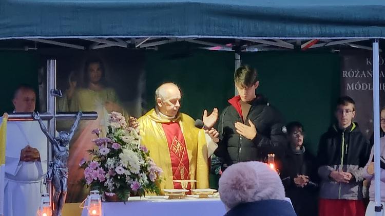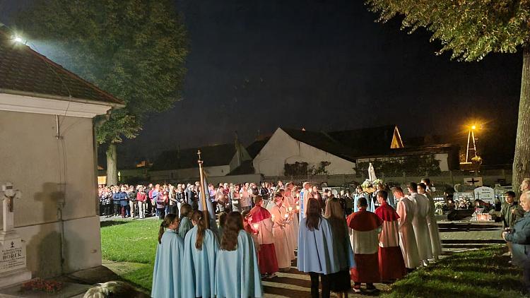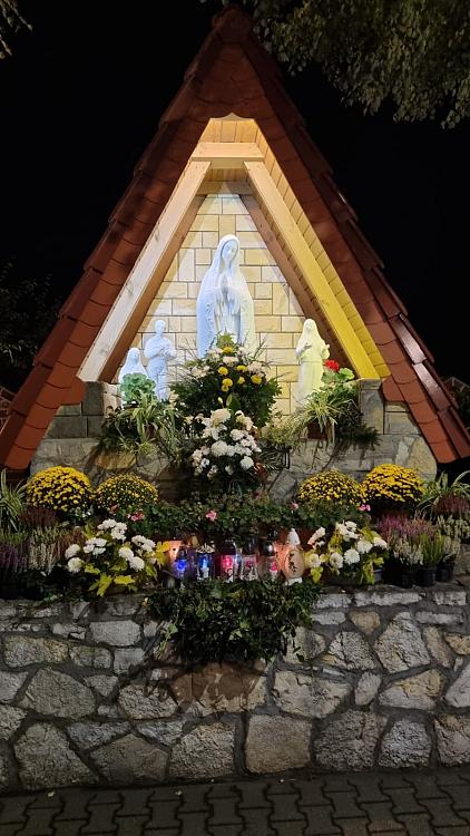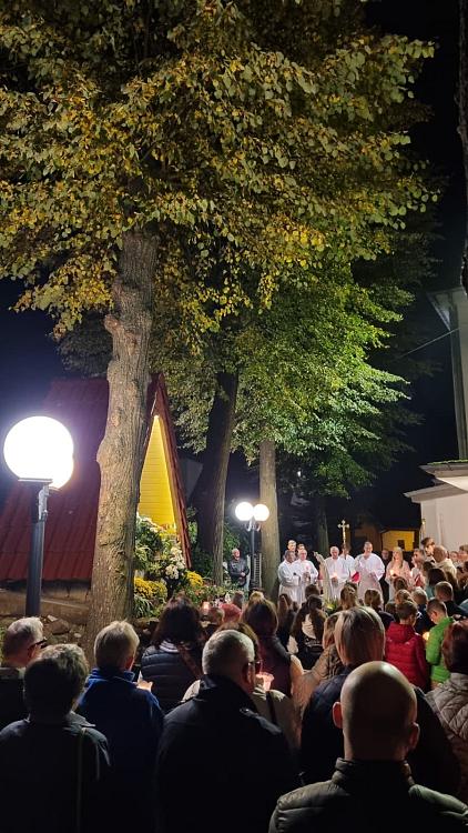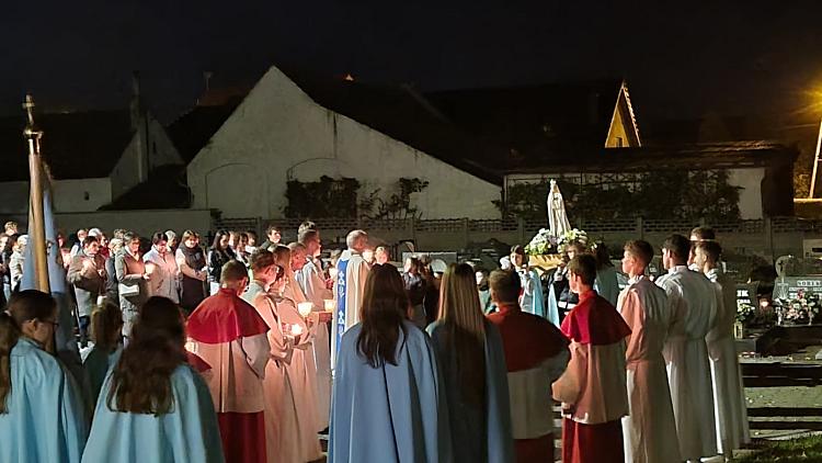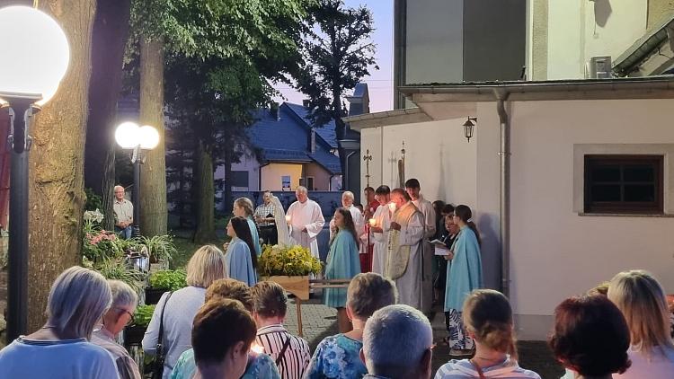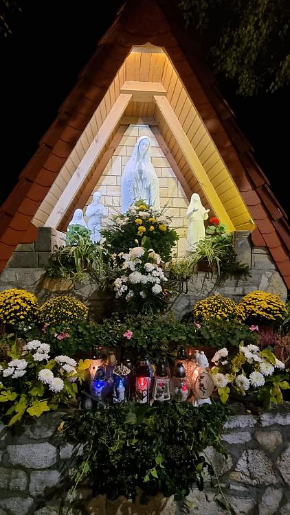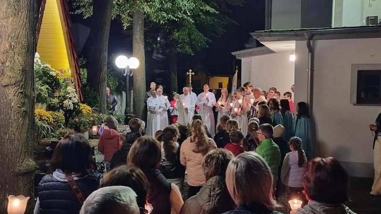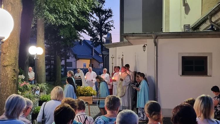 W poniedziałkowy wieczór zgromadziliśmy się na Mszy św., po której odmówiliśmy różaniec zakończony procesją do groty Matki Bożej Fatimskiej.