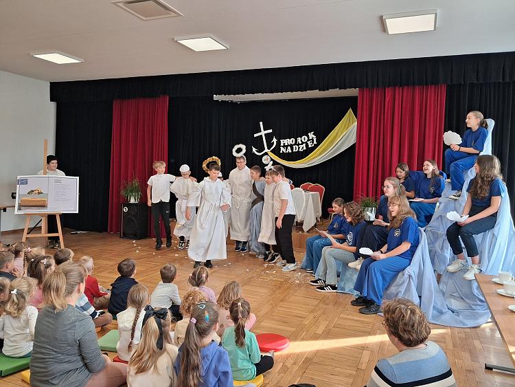 Uczniowie kl. VI przygotowaliu w tym roku z okazji Dnia Papieskiego spektakl pt. "Anioł Stróż Karola Wojtyły". W szkole ten dzień odbył się 16 pażdziernika, a w liturgiczne wspomnienie św. Jana Pawła II - 22 pażdziernika - jeszcze raz powtórzono spektakl - tym razem na sali Domu Kultury. Na to wydarznie zaproszono mieszkańców naszej parafii, którym wolontariusze z kl. VIII przygotowali również słodki poczęstunek.
